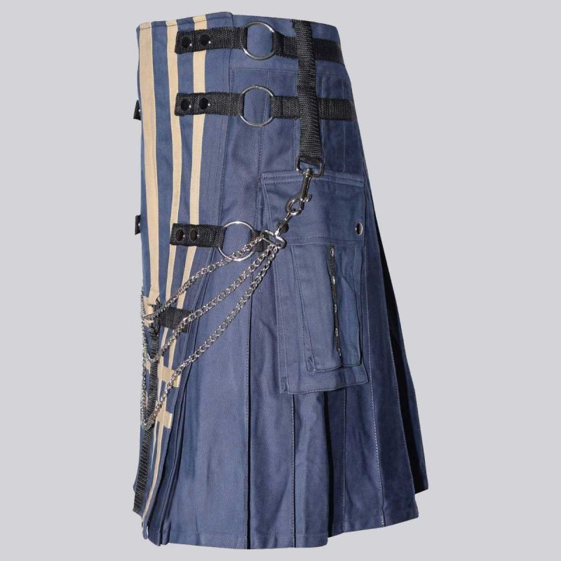 A Gothic Fashion Utility Kilt is a stylish piece of clothing that combines elements of gothic fashion with the practicality of a utility kilt. It features unique designs, often in dark colors or patterns, and is made to provide comfort and mobility. Many people wear it for fashion or to express their individuality while enjoying the functions of a traditional kilt.