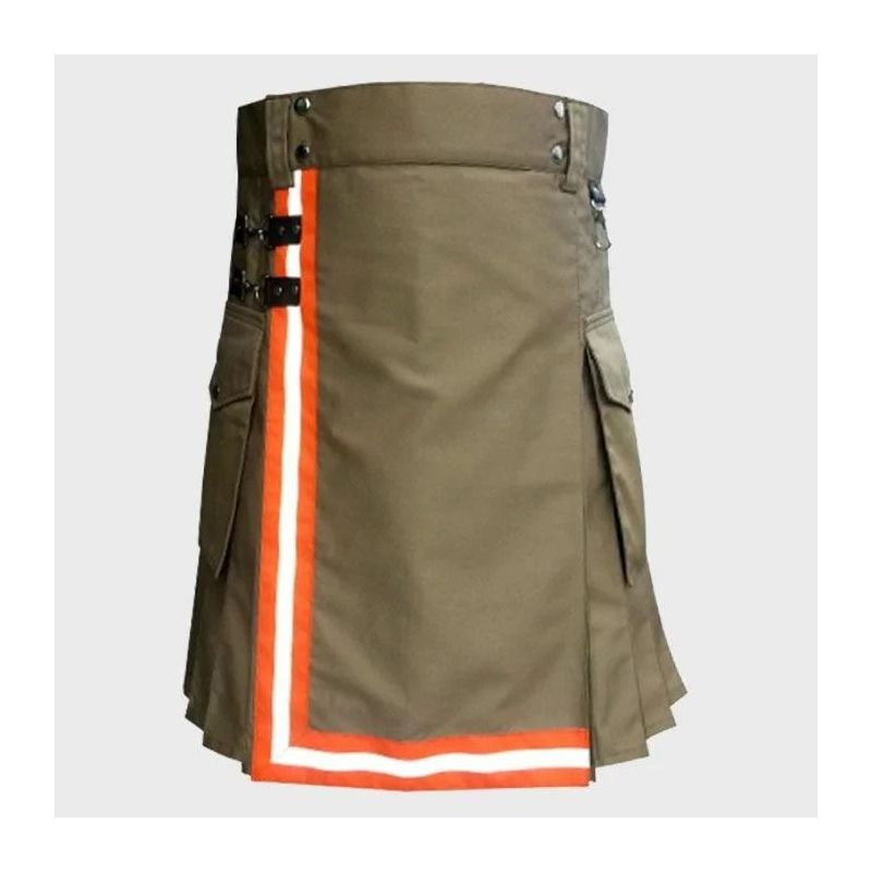 The Khaki Firefighter Utility Kilt is designed for those who embrace adventure and practicality in their everyday wear. Ideal for firefighters, outdoor enthusiasts, and anyone seeking a versatile and unique garment, this kilt merges functionality with style. Whether you're at a job site, enjoying outdoor activities, or attending a casual gathering, this utility kilt offers both comfort and a rugged aesthetic.Crafted with multiple utility pockets and a durable build, this kilt is designed to withstand tough environments and keep your essentials easily accessible. The striking khaki color not only adds a contemporary touch but also highlights its rugged appeal. Additionally, the adjustable waist and sturdy belt loops ensure a perfect fit, making it comfortable for all-day wear while enabling ease of movement.Constructed from high-quality cotton blend fabric, the Khaki Firefighter Utility Kilt is built for durability and breathability. The fabric is lightweight yet resilient, ensuring you stay comfortable in varying temperatures and conditions. Easy to clean and maintain, this kilt is perfect for active individuals who value both quality and practicality.In conclusion, the Khaki Firefighter Utility Kilt is an essential addition to any man's wardrobe. Combining functionality, comfort, and style, it's perfect for those who lead dynamic lifestyles. Elevate your attire with this versatile kilt that stands up to the demands of your day while keeping you looking sharp.