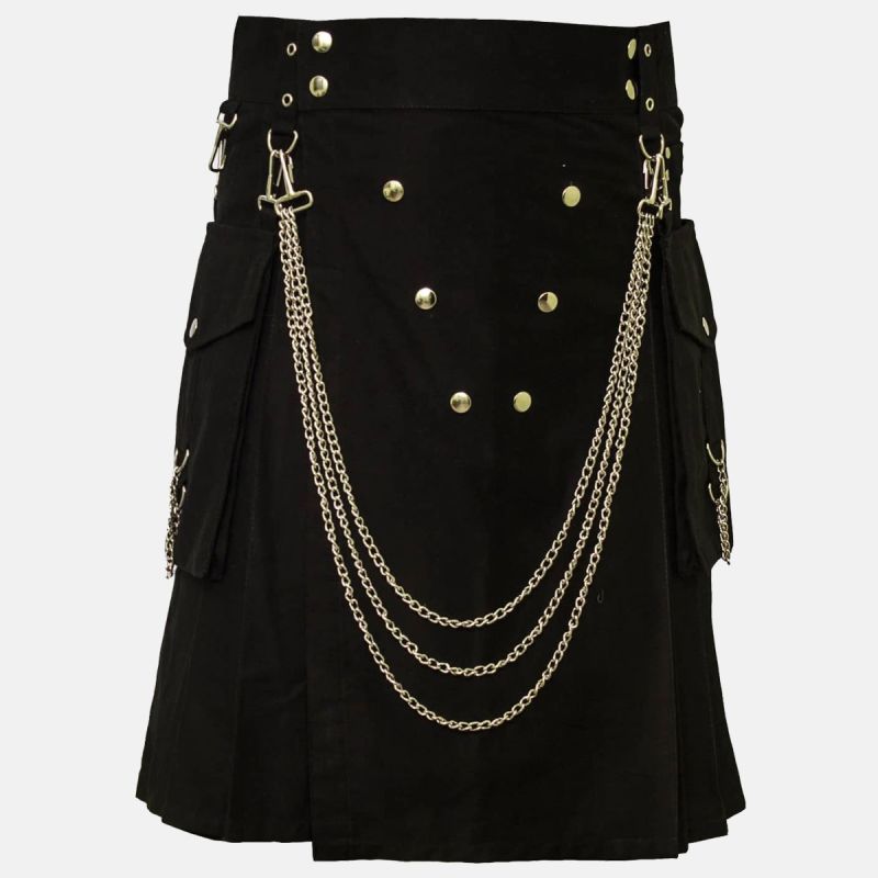 Introducing the Black Cargo Utility Kilt With Chains, the perfect blend of style and functionality for modern men who appreciate versatility. Recommended for outdoor enthusiasts, festival-goers, or anyone looking to make a bold fashion statement, this utility kilt is designed to provide comfort while offering plenty of storage. Whether you’re hiking, cycling, or enjoying a relaxed day at a music festival, this kilt has got you covered.Crafted with an eye for detail, this kilt features multiple cargo pockets and stylish chains, making it not just a garment but a utility piece. The contemporary design with an adjustable waist ensures a perfect fit, while the classic black color adds a touch of sophistication. The unique chains not only enhance its edgy aesthetic but also provide an extra layer of utility, allowing you to easily secure your belongings.Made from a high-quality blend of 100% cotton, the Black Cargo Utility Kilt is breathable, durable, and easy to care for, making it ideal for everyday wear. The lightweight fabric drapes comfortably around your legs, ensuring freedom of movement throughout the day. Plus, it’s machine washable for hassle-free maintenance.In conclusion, the Black Cargo Utility Kilt With Chains is an essential addition to any wardrobe. It effortlessly merges practicality with a distinctive style, making it suitable for various occasions. Embrace your individuality and elevate your fashion game with this striking kilt—your new go-to choice for comfort, utility, and bold expression.